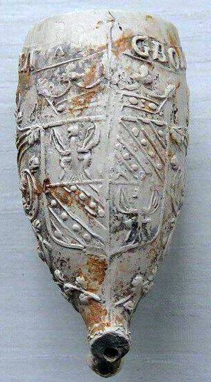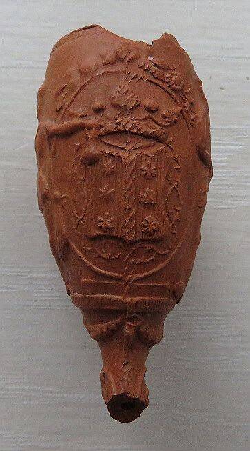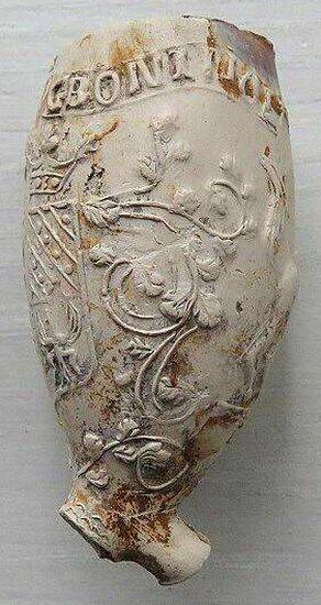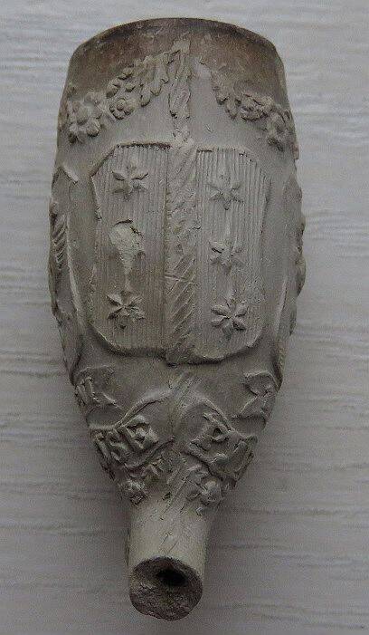 Kleipijp (Archeologische Stichting Golda) met rond een wapenschild een nogal versimpeld onbeholpen uitgevoerde gekroonde leeuw