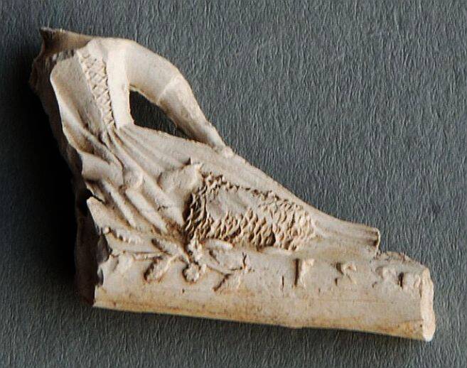 Fragment van polkapijp (lade26FM005). Aan de ene kant de molen en aan de andere kant stadswapen Gouda. 2e helft 19e eeuw.