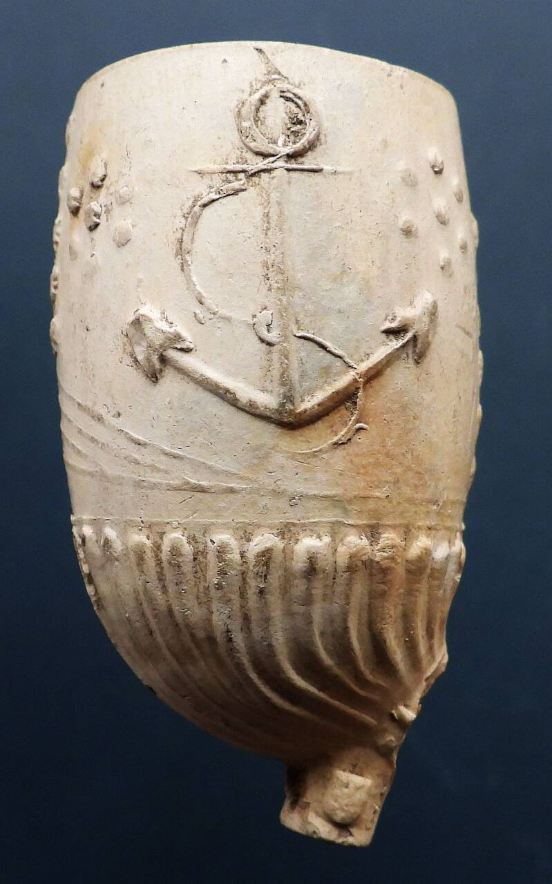 Kleipijp (Aad Kleijweg) Kromkop, Anker + Stippelrozen. Andere kant ook anker + stippelrozen en blaadjes op de persnaad. Gouda. 1840-1880.