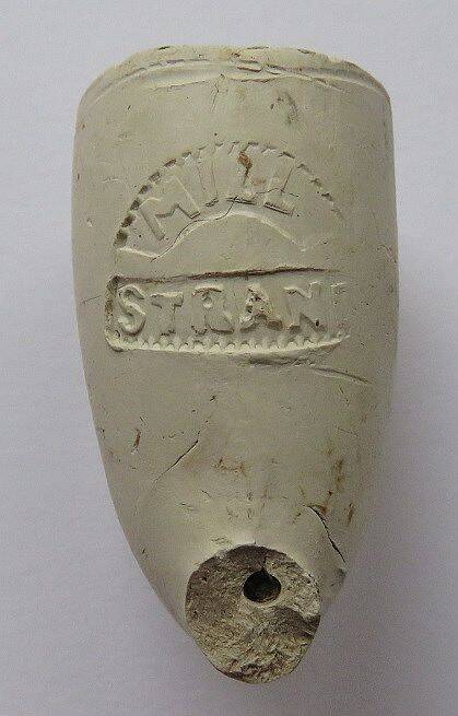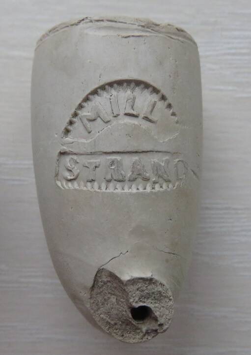 Kleipijp (Lade18FM1155) Rondbodem exportpijp met op de voorkant ketel de tekst: MILL STRAND. Gouda. 2e helft 19e eeuw.