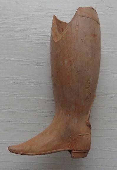 Kleipijp (lade18FM1076) in de vorm van een laars. Gouda. Hielmerk: molen. 2e helft 19e eeuw.