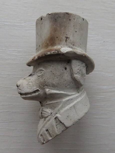 Kleipijp (lade18FM1065) Hondengezicht met hoed. Gouda. 2e helft 19e eeuw. Pijpenmaker: