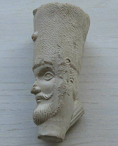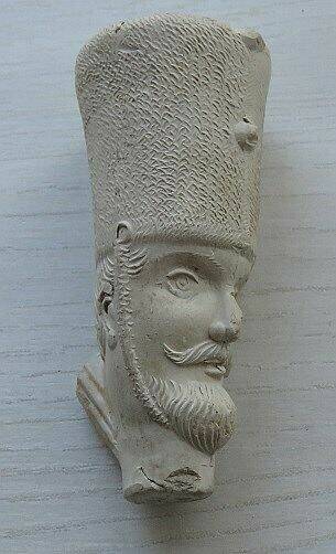 Kleipijp (Lade57FM107) Figuraal van een huzaar met snor, baard en berenmuts. Gouda. 1870-1890. Merk; Molen.