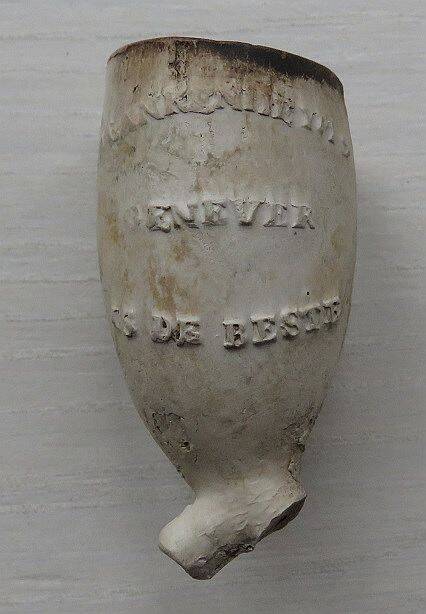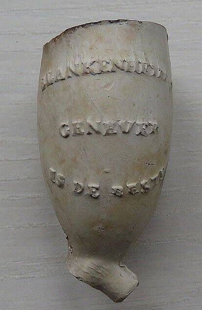 Kleipijp (lade38FM018) met BLANKENHEYMS GENEVER IS DE BESTE / BLANKENHEYMS GENEVER IS DE BESTE . 1870-1900. Hielmerk GN gekroond. Pijpenmaker: Firma Frans Simon Sparnaay & Zoon. Vindplaats: Gouda/polder Achterwillens.