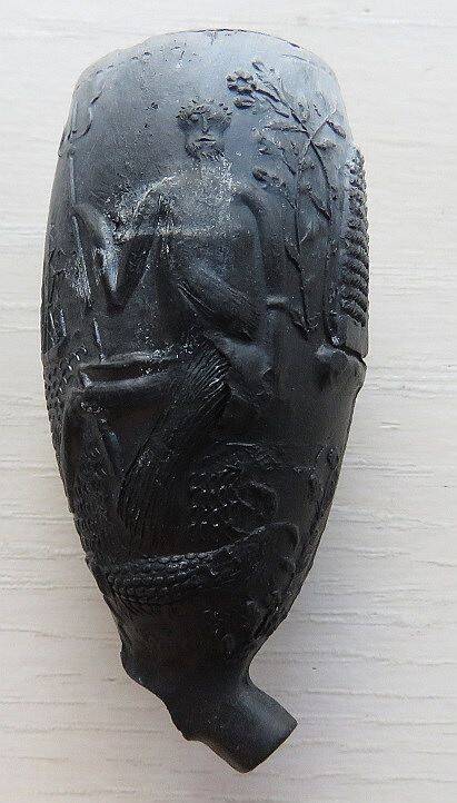 Kleipijp(part verz AdeB) in zwarte uitvoering met rondom personen.1840-1880. Hielmerk: Molen. Pijpenmaker: Sparnaay.