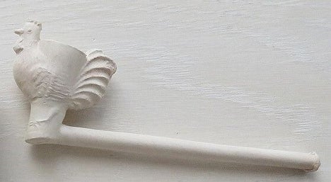 Kleipijp (Lade33FM49A) figuraal met de voorstelling van een haan. 2e helft 20e eeuw. Pijpenfabriek: Firma Trumm-Bergmans Weert.