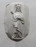 Kleipijp (Lade41PW27) Rondbodem met de voorstelling van Maria met kind en aan beide zijden de kapel Onze Lieve Vrouw in 't Zand in Roermond.