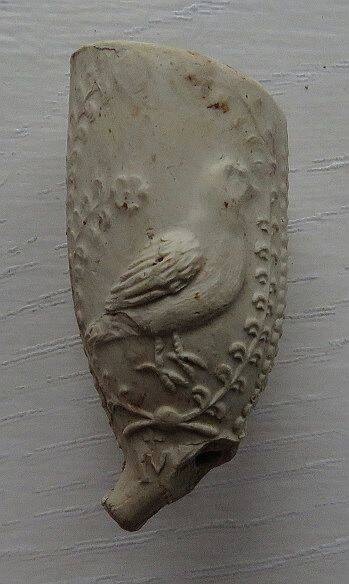 Kleipijp (lade17FM34) met aan de ene kant een ton met vogel. Aan de andere kant een koffiekan. Omstreeks 1730.