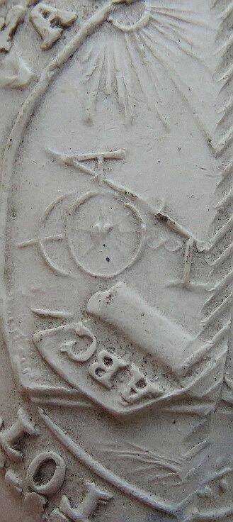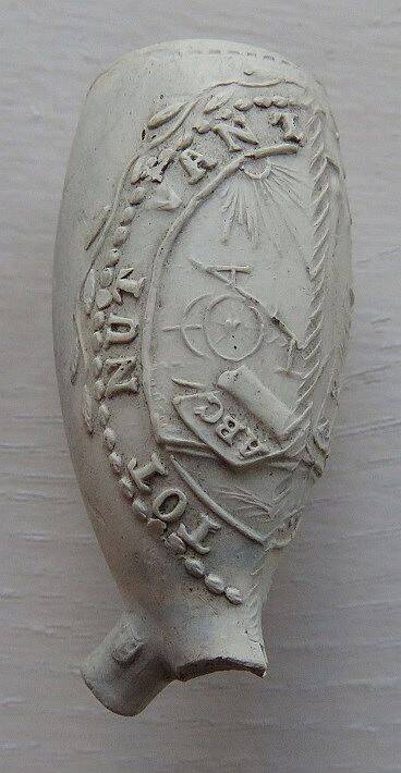 Kleipijp (lade17RS14). Afgebeeld op deze pijp zien we een medaillon met rondom de tekst TOT NUT VAN 'T ALGEMEEN en verder zien links een tweewielig voertuig, mogelijk een Sjees, de letters ABC in de zonnestralen en rechts een grote vaas met deksel en ketting daarvoor de tekst GOEDE ZEDEN. Hielmerk 46 gekroond. Pijpenmaker: Cornelis van Leeuwen. 1784-1850.