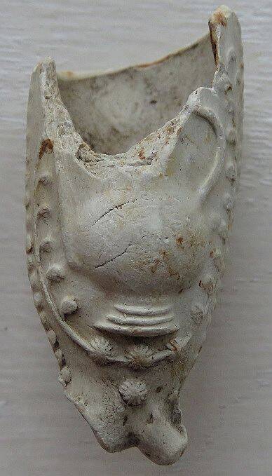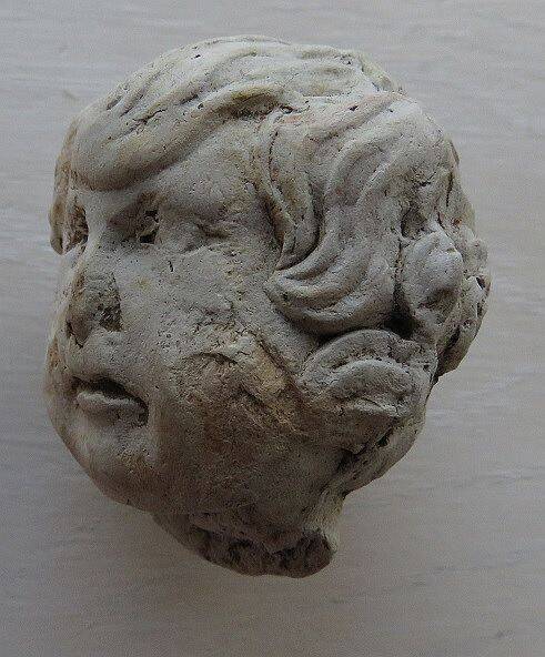 Pijpaarde beeldje (Lade17FM19) Figuraal met de voorstelling van het gezicht van een engeltje dan wel putti. 1e helft 17e eeuw.