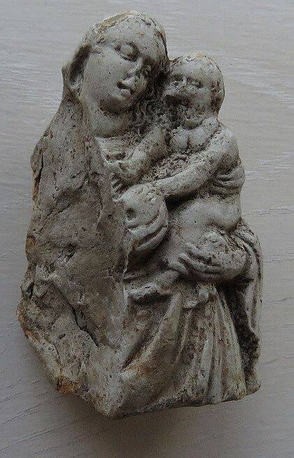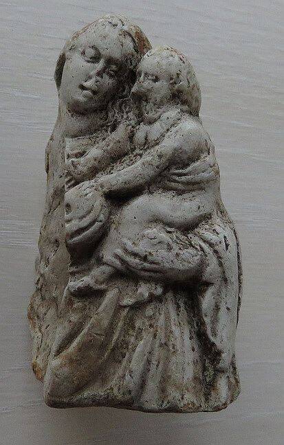 Pijpaarde beeldje (Lade17FM20) Figuraal met de voorstelling van MARIA met het kindeke Jezus op haar arm. 1e helft 17e eeuw.