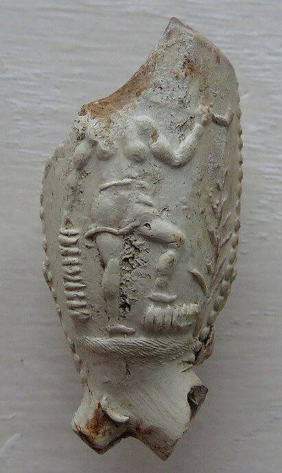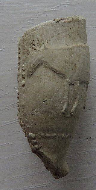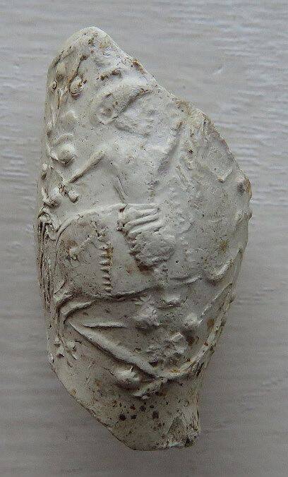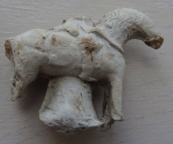 Pijpaarde beeldje (Lade17FM22) Figuraal met de voorstelling van ruiter te paard. Ruiter ontbreekt. 17e eeuw. Hoogte beeldje: Ca. 4 cm. Gouda? Was een nevenproduct van een pijpenmaker.