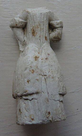 Pijpaarde beeldje (Lade17FM24) Figuraal met de voorstelling van persoon. 17e/18e eeuw. Hoogte beeldje: Ca. 3 cm. Gouda? Was een nevenproduct van een pijpenmaker.