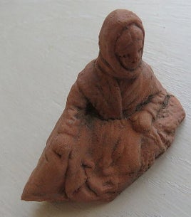 Beeldje van rode klei (Lade17FM27) met de voorstelling van een vrouw met hoofddoek op. Ca. 1900. Gouda?