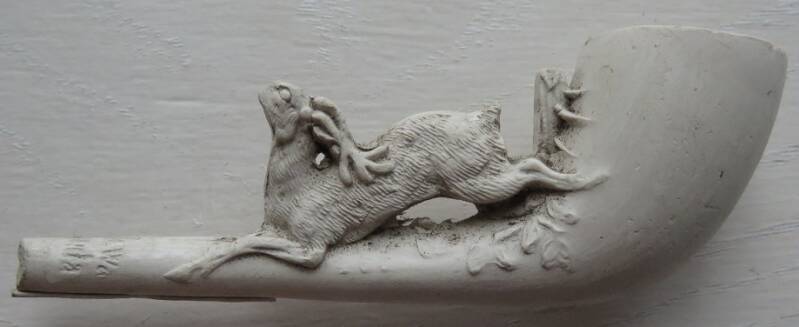 Kleipijp (lade17FM42) met een liggend hert op de steel met gewei in de nek. Ca. 1900. Pijpenmaker: P. Goedewaagen & Zoon hetgeen ook op de steel staat met bandmerk. Vindplaats: Reeuwijk Platteweg tuinderij/polder Achterwillens.