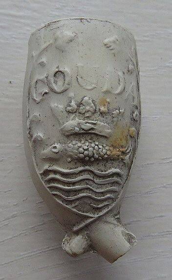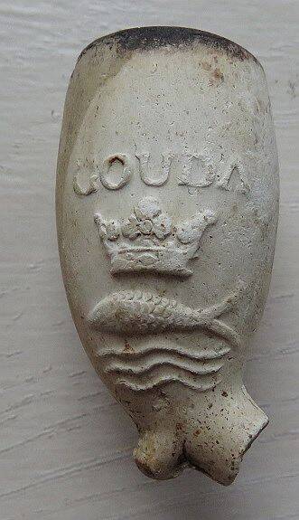 Kleipijp (Lade17FM47) Zijmerk: Gouda en vis gekroond. Achterkant pijp: kwaispedoor. Gouda. 1750-1780. Pijpenmaker: Barend Palmboom
