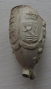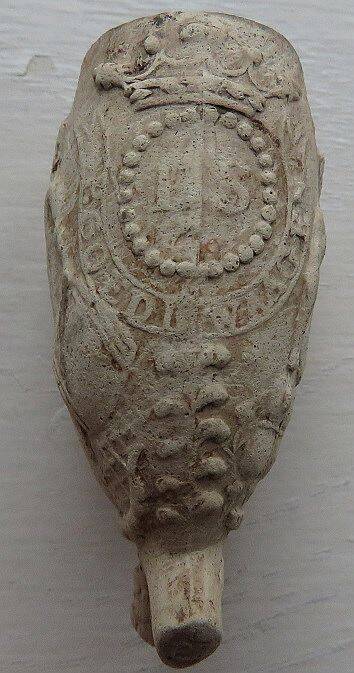 Kleipijp (Lade17FM32) met aan de ene kant een ruiter te paard (stadhouder WILLEM III) en aan de andere kant een Stadhouderlijk wapen.