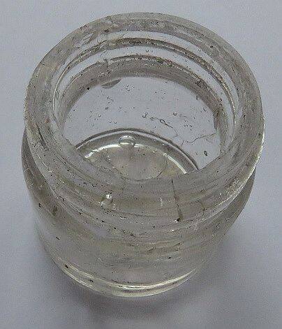 Glazen potje met schroefdop. Eind 19e/begin 20e eeuw. Maat 4 cm hoog en 3,6 cm breed