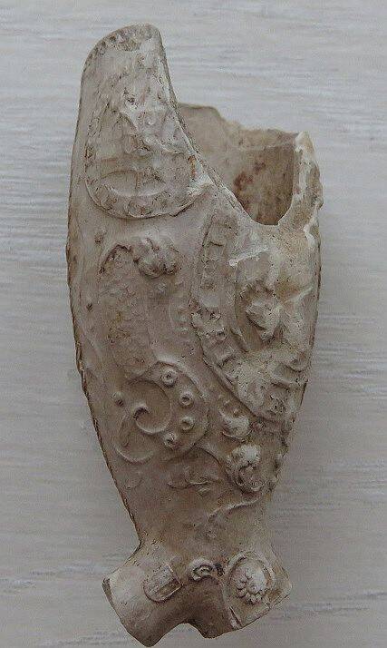 lade71FM2 Kleipijp stuk baroksteel 10 cm. fraai bewerkt met blaadjes. Ca. 1635. Gouda.