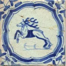 Tegels met een driestip als hoekvulling zijn veelvuldig in Gouda gemaakt door het 17e eeuwse bedrijf van Willem Verswaen. De tegelschilder is bij deze tegel niet al te precies te werk gegaan bij het inschilderen van het groen, want een flink deel ervan is terecht gekomen buiten de blauwe omlijning. Het kan zijn dat een leerling schilder de groene invulling heeft gedaan. Het vervaardigen, schilderen en bakken van tegels in de 17e eeuw was stukwerk. Werknemers stonden onder grote druk om maar zo snel mogelijk te werken want de concurrentie was moordend. Een tegel kostte niet meer dan een paar cent. En die snelheid van werken ging nogal eens ten koste van de kwaliteit.