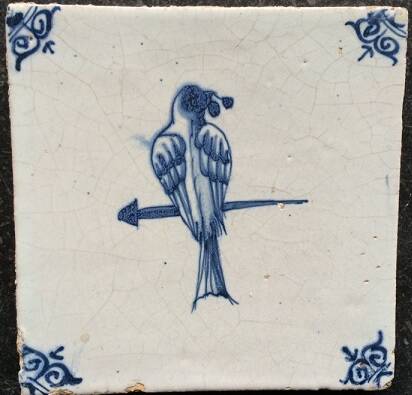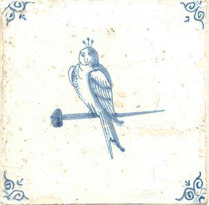 Links een prachtige geschilderde spijkervogel met de afbeelding van een papegaai. Maar de tegel is wel recentelijk gemaakt. De gaatjes in de hoeken zijn wel erg groot uitgevallen. Ter vergelijking rechts een spijkervogel met dezelfde voorstelling die wel door de SWAEN in de 17e eeuw is vervaardigd.