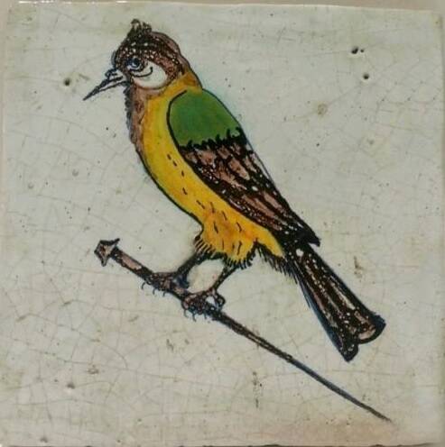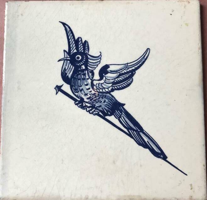 Zelfde voorstelling van een vogel op spijker als de tegel boven maar deze tegel is veel flatser van kleur.
