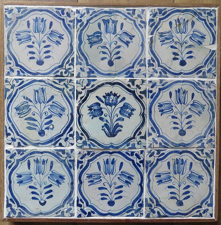Een overzicht van de tegels. Het gaat om tegels die zijn vervaardigd rond het midden van de 17e eeuw.