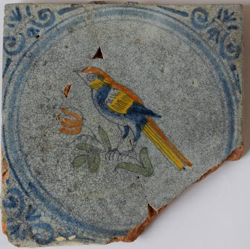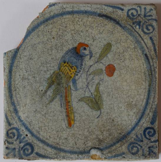 Tegel met vogels. 17e eeuw. Vrijwel zeker geproduceerd door de Goudse tegelfabriek De Swaen.