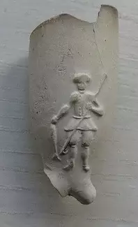 Kleipijp (Ds1FM). Trechterpijp. Hielmerk: Schutter (soldaat met richtstok). Gouda. Ca. 1713-1728. Pijpenmaker: Willem Willemsz. Maerloo