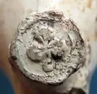 Kleipijp. Trechter vroeg. Zijmerk: Roos 7 stippen. Gouda?