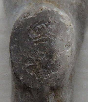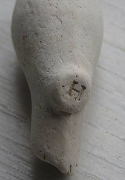 Kleipijpje(lade1FM424) van de 1e generatie met een hielmerk met kruis zonder stippen. Vindplaats: onbekend.