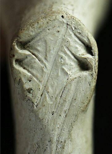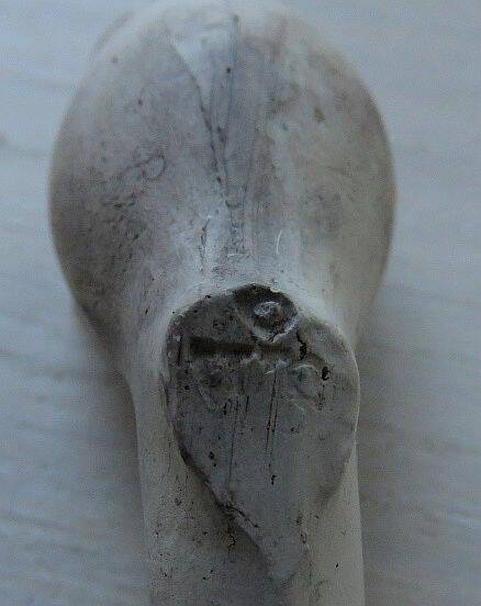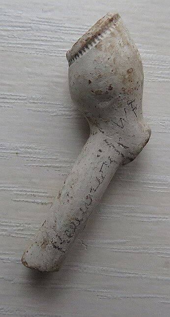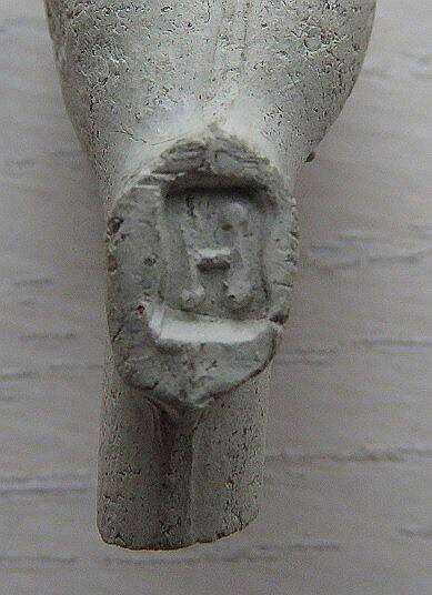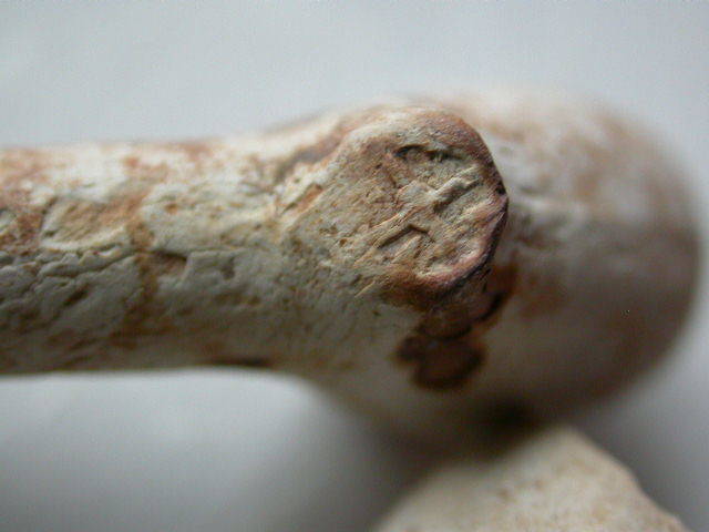 Op de steel van de twee onderstaande kleipijpen staan gestempelde merken. De manier waarop dat is uitgevoerd is zeldzaam.