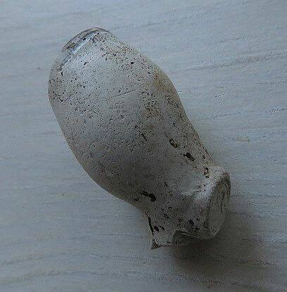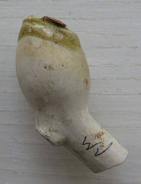 . Dit pijpje met gele glazuurresten is gevonden in de directe omgeving van een pijpenstort van vroeg 17e eeuwse kleipijpen waaronder diverse barokpijpjes.Vindplaats: Waddinxveen polder Bloemendaal
