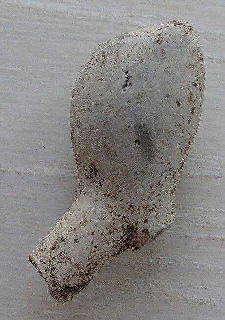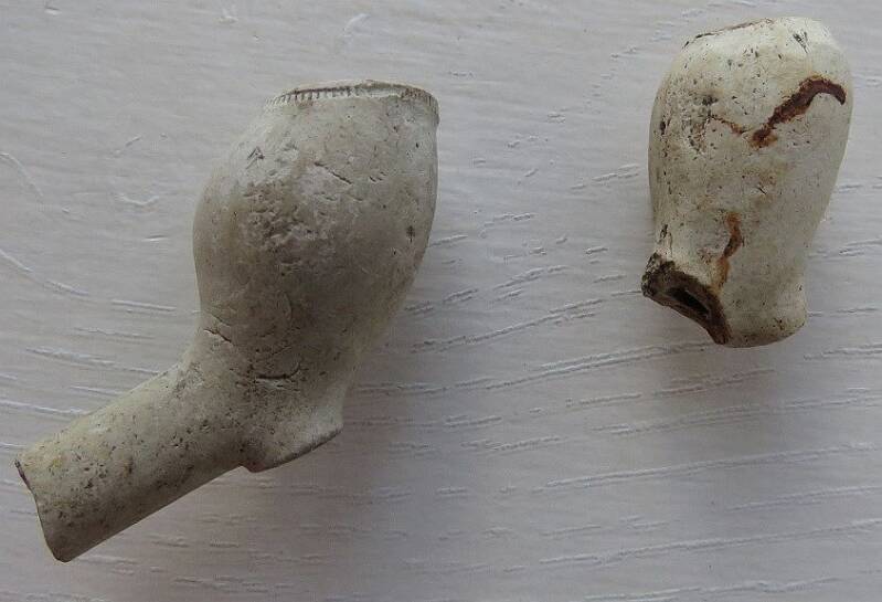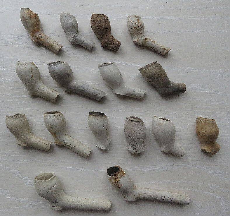 Een paar honderd van die vroege 1e generatie kleipijpen zijn als bodemvondst gevonden in de polder Bloemendaal nabij Waddinxveen. Wat hoogst opmerkelijk was, soms werden ze gevonden tezamen met stortafval van barokpijpjes en andere vroeg 17e eeuwse kleipijpen gemaakt door Goudse pijpenmakers. Onderstaande pijpenkopjes zijn vervaardigd tussen 1590 en 1610. Twee pijpenkopjes hebben een soort van hielmerk. Bekend is dat Engelse pijpenmakers al rond het einde van de 16e eeuw begonnen waren om in de Nederlanden kleipijpen te vervaardigen. Waarschijnlijk gebeurde dat ook al in Gouda. Nader onderzoek zal dat moeten bevestigen.
