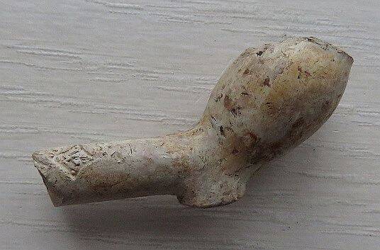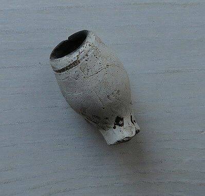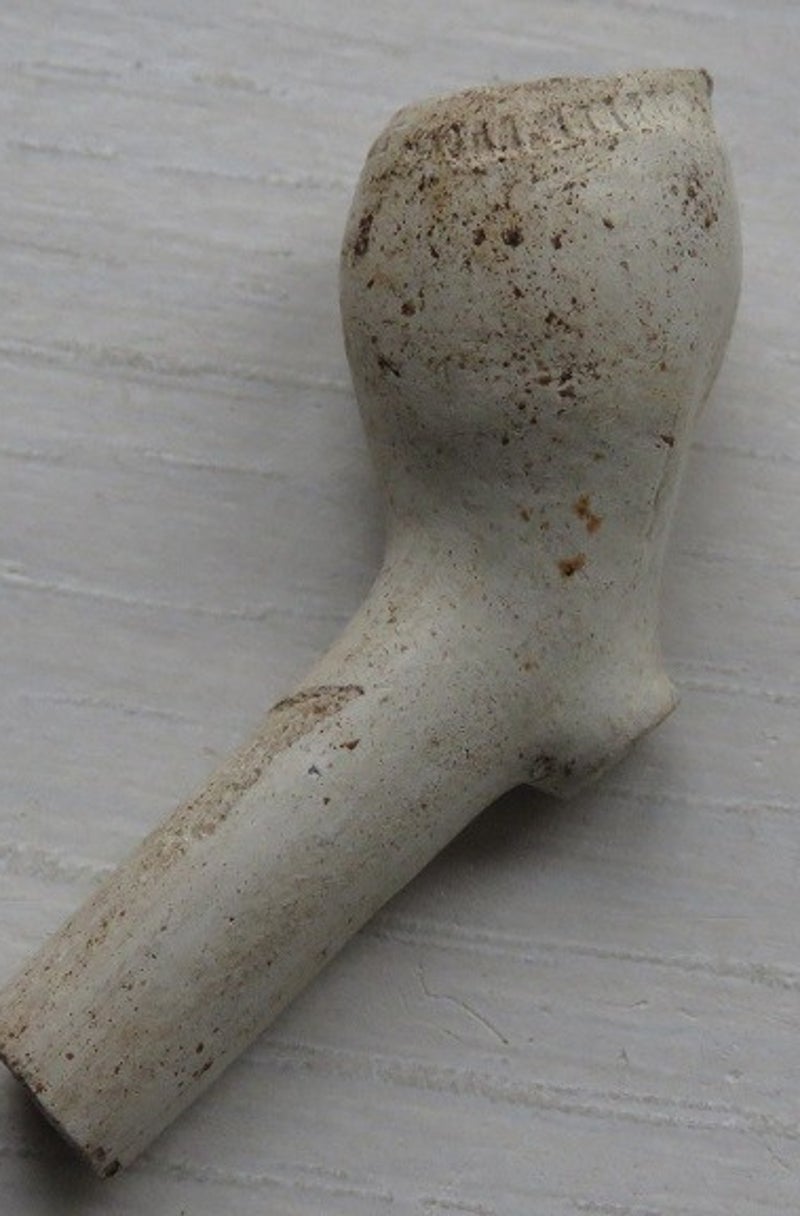Het onderstaande pijpenkopje (part verz) is vervaardigd omstreeks begin 17e eeuw. Bodemvondst Polder Bloemendaal te Waddinxveen.De pijpenkop is rondom versierd met kleine rondjes die zijn ingedrukt in de nog vochtige pijpenklei. Als hielmerk is ook een rondje geplaatst zoals die ook op de ketel zijn ingedrukt. Dat het hier om een vroeg product moet gaan wordt bevestigd door de ruime diameter van het rookkanaal in de steel, goed te zien op de foto rechts. Frappant is dat de rondjes exact dezelfde diameter hebben als de doorsnede van het rookkanaal. Dit kan betekenen dat de rondjes zijn aangebracht met de punt van de wijer, waarbij de vraag zich voordoet of de wijer dan wellicht een hol en puntig voorwerp was.