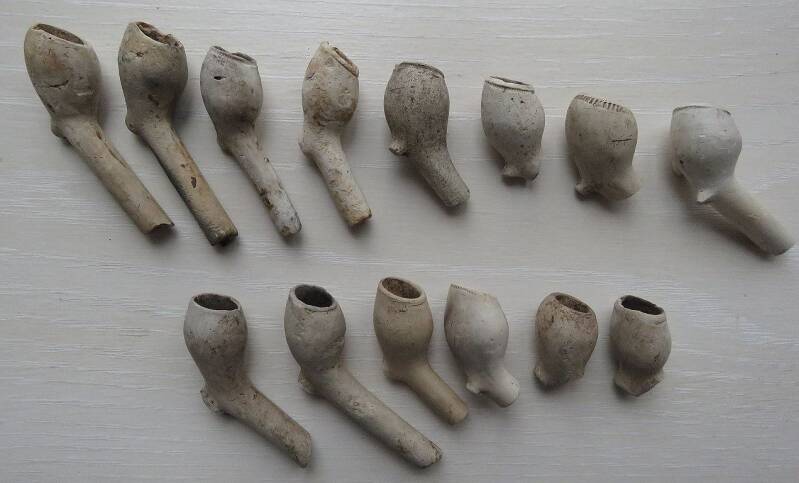 Kleipijpen (Lade19FM1A) groep van 14 stuks vroege 1e generatiepijpjes uit de periode 1595-1625. Ze hebben geen hielmerk.