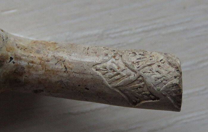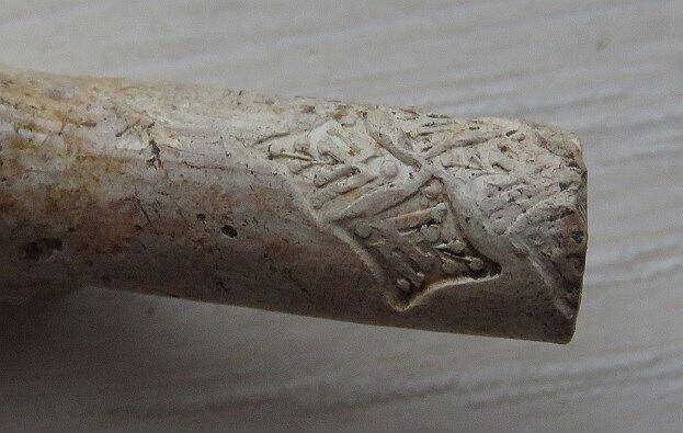 Zeldzaam kleipijpje (lade1FM1257) van de 1e generatie met radering aangebracht op de ketel. Bodemvondst poldergebied Middelweg Moordrecht. Met als hielmerk de Tudorroos aangevuld met de letters LF. Datering: ca. 1600-1620.