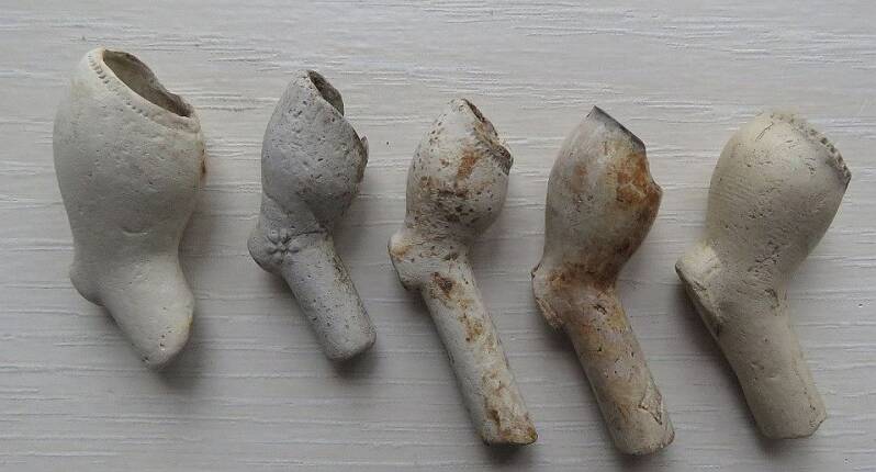 Vier stuks kleipijpjes waarvan de drie linkerexemplaren behorende tot de 1e generatie