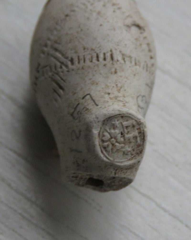 Kleipijpje(lade1FM1620) van de 1e generatie met een hielmerk met kruis en stippen. Vindplaats: poldergebied