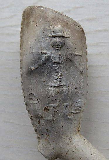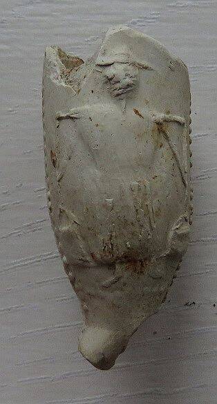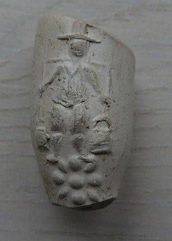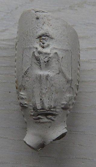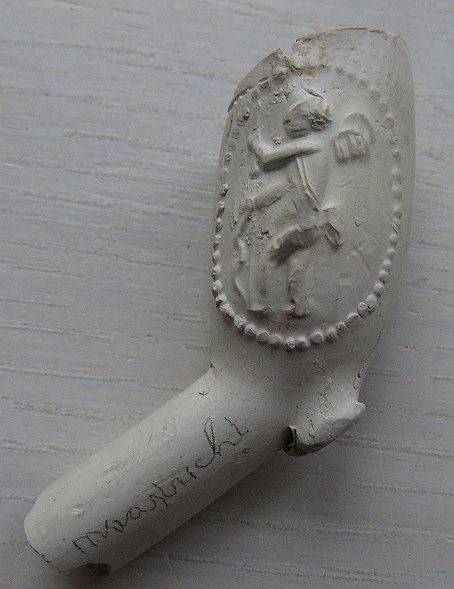 Kleipijp (ds29FM584), geen parelnaadpijp, met aan twee kanten personen. Maastrichtse produktie. Eind 17e eeuw.