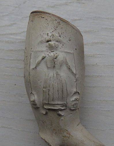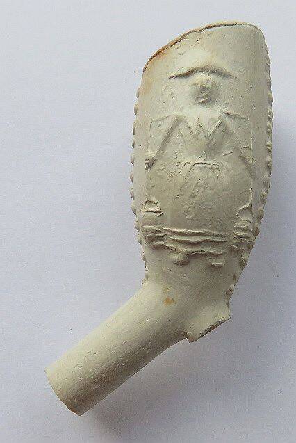 Opmerking: Dit is een vroeg trechtervormig oranjepropaganda pijpje. De letters KR bij de koning betekenen Koning REX en de letters MR bij de koningin Mary Regina. De personen hier afgebeeld zijn respectievelijk stadhouder Koning Willem III en zijn vrouw koningin Mary Stuart. Pijpje is mogelijk in productie gekomen nadat stadhouder prins Willem III in 1689 tot koning van Engeland, Schotland en Ierland werd gekroond