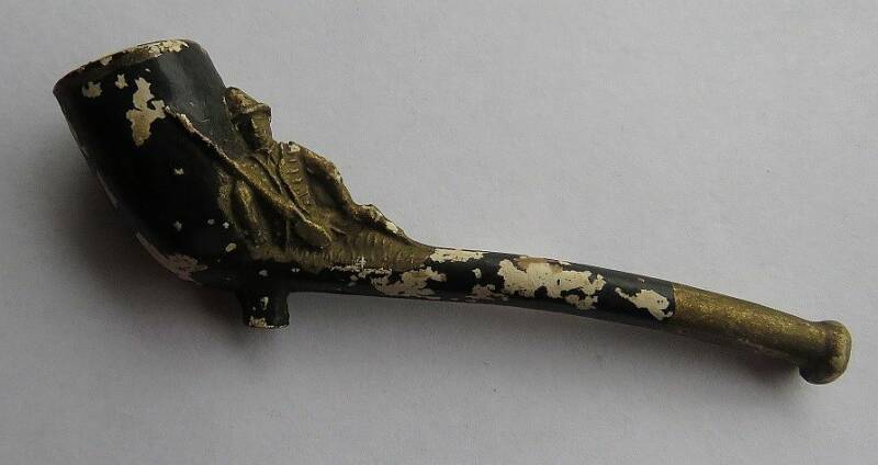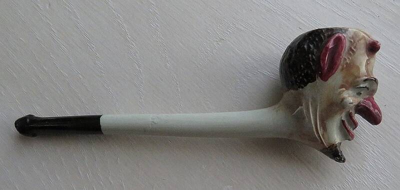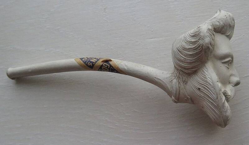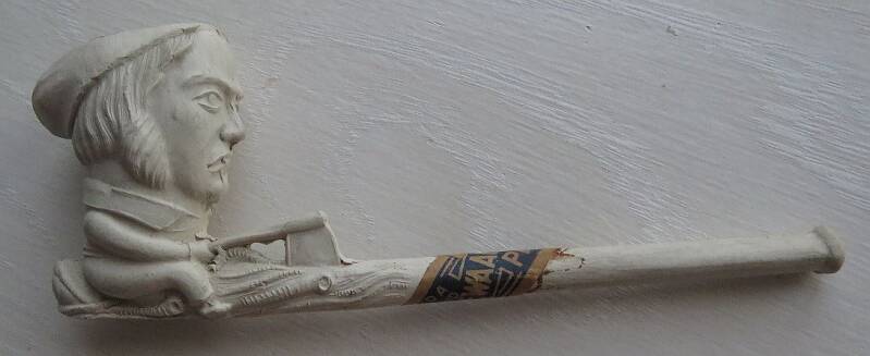 Met een zgn pijpensleetje waarin de afbeelding staat van een man die een lange pijp aansteekt. Ca. 1900-1920.