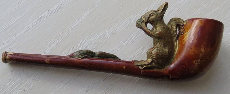 Kleipijp (Ds8partverz20) met een etende eekhoorn en op de steel een wortel met loof. Op de onderkant gestempeld de naam GOEDEWAAGEN GOUDA. De pijp is gebruind en de eekhoorn is goudkleurig gemaakt. Goedewaagen Gouda. Ca. 1900