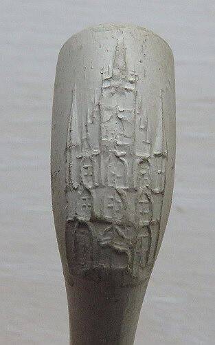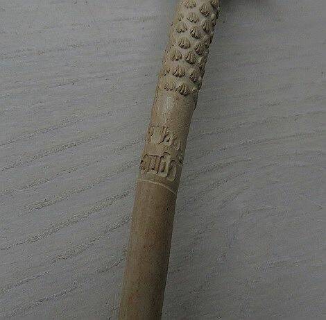Knorren versiering die doorlopen naar de steel. Ingedrukte tekst Goedewaagen Gouda op steel.