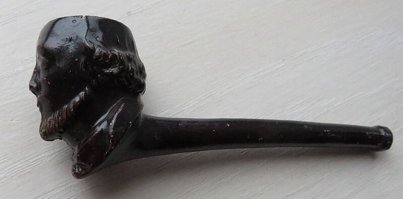 Kleipijp (Lade33FM11) figuraal met de voorstelling van een man met baard. (Handelsnaam Zeekapitein). Pijp geglazuurd. 1900-1920. Gouda.