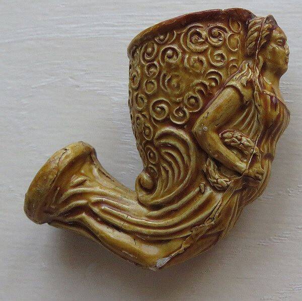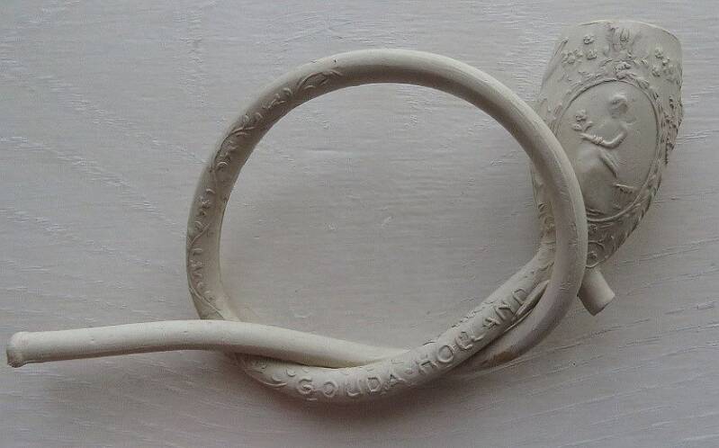 Zeldzaam. Gave kleipijp (part verz) manchettype gelakt met de voorstelling van een vrouwelijk persoon met krans. Gouda. Ca. 1900-1920.
