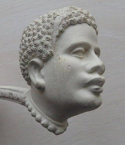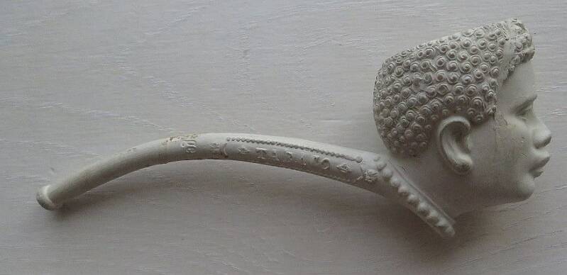 Complete en gave kleipijp (Lade33FM2)met de voorstelling van een gezicht, Afrikaanse man. Gouda.