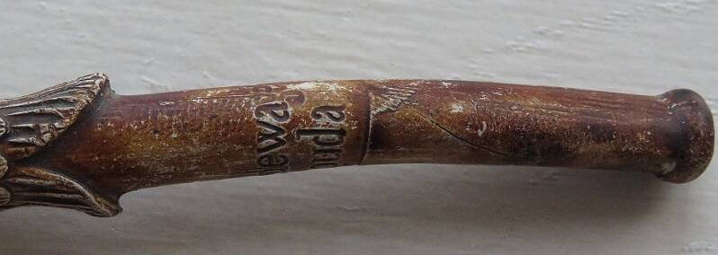 Kleipijp (Lade8FM19) Manchetpijp met de voorstelling van een vogelpoot. Gouda. Ca. 1900. Merk: ES gekroond. Pijpenfabriek: P. Goedewaagen & Zoon.