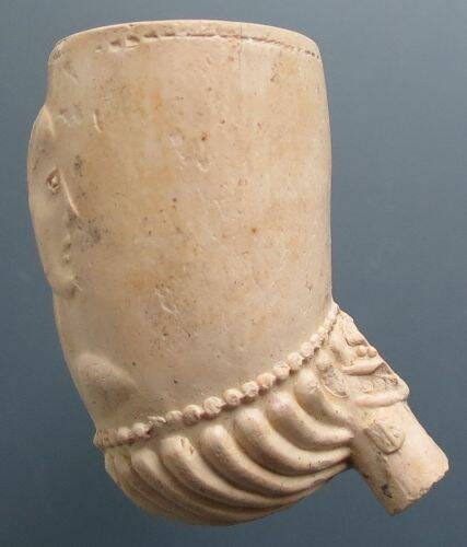 Kleipijp (part verz) met Aan de voorzijde van de ketel een portret van een vrouw en profil. Onderzijde lobben met parelrand.