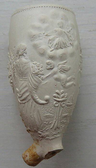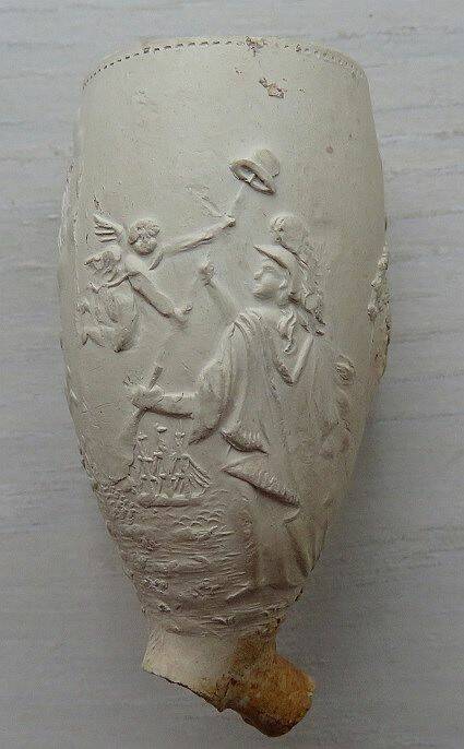 Kleipijp (lade23FMgeennummer) met Reliëf van parelrijen. Soldaat / Marketentster in medaillons.